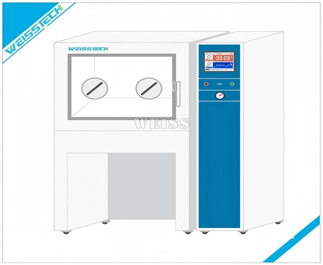 5、試驗箱門采用大窗口雙層真空鋼化玻璃,有效隔熱保溫。窗口設有兩個操作入口,采用乳膠長手套進行隔離,避免人工操作過程中對恒溫恒濕條件的影響。